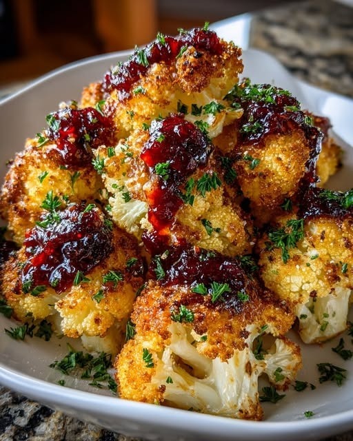 Serve: Transfer the glazed cauliflower to a serving platter. Garnish with fresh parsley and extra dried cranberries if desired. Serve warm as a side or even a main for a vegetarian-friendly meal.